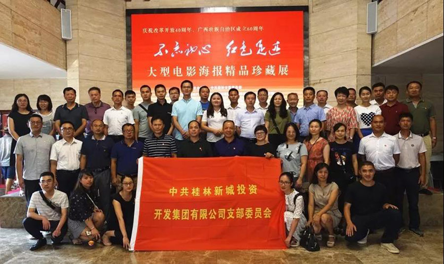 為深入學(xué)習(xí)貫徹落實(shí)習(xí)近平新時(shí)代中國(guó)特色社會(huì)主義思想和黨的十九大精神,慶祝改革開放40周年、自治區(qū)成立60周年,2018年8月23日上午新城投資集團(tuán)黨支部組織全體黨員和中層副職以上干部參觀“不忘初心?紅色足跡”大型電影海報(bào)精品珍藏展。臨桂新區(qū)工委委員、臨桂新區(qū)管委會(huì)副主任覃正東,新城投資集團(tuán)黨支部書記周道林以普通黨員身份參加了此次活動(dòng)。
