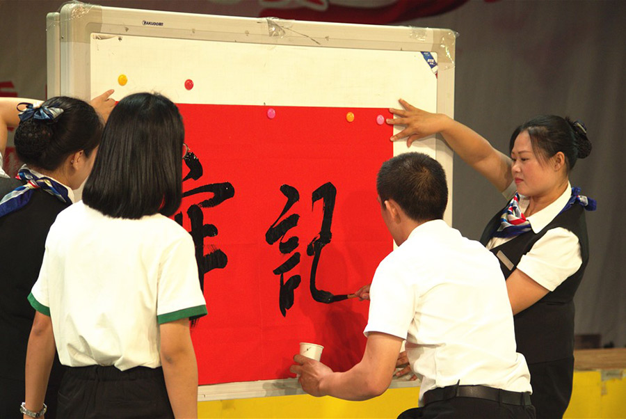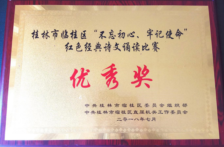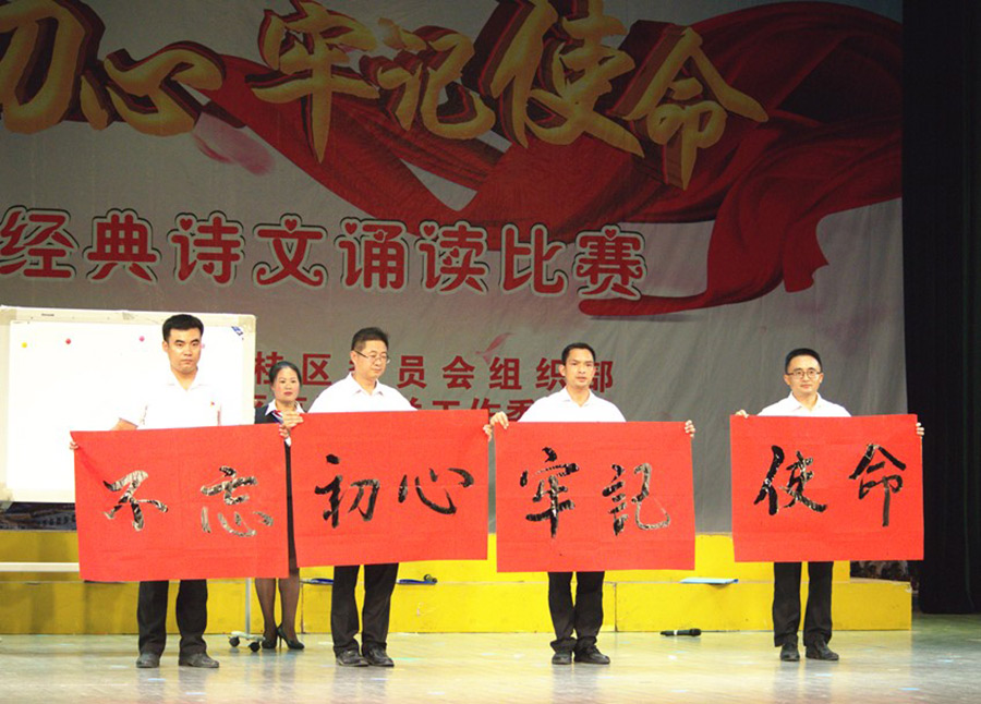活動(dòng)中,選手們通過朗誦紅色經(jīng)典詩(shī)詞,深情回顧黨的光輝歷程、謳歌黨的豐功偉績(jī),真誠(chéng)地表達(dá)了對(duì)黨、對(duì)祖國(guó)的擁護(hù)與熱愛之情。參賽選手們儀態(tài)莊重大方,朗誦聲情并茂,以配樂、舞蹈、書法展示等多種形式,或深情款款、或激情高昂,用飽滿的熱情將紅色經(jīng)典的內(nèi)涵精彩地展現(xiàn)在觀眾面前,充分展示了臨桂區(qū)廣大黨員干部的良好精神風(fēng)貌。新城投資集團(tuán)黨支部四名黨員聲情并茂地共誦《不忘初心,牢記使命,我們永遠(yuǎn)在路上》,節(jié)目形式新穎,選手感情充沛,朗讀完詩(shī)歌后,黨員譚佳璐現(xiàn)場(chǎng)飽含情感的用毛筆書寫了“不忘初心,牢記使命”八個(gè)大字,表達(dá)了黨員們樹立遠(yuǎn)大的理想、力爭(zhēng)上游、為祖國(guó)的強(qiáng)盛貢獻(xiàn)力量的決心。與其說這是紅色經(jīng)典詩(shī)文誦讀,不如說這是一次視聽盛宴,更是黨員們愛黨愛國(guó)的精彩演繹。