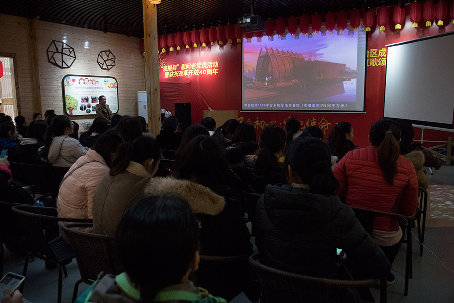 圖為婦女同志們觀看會(huì)仙濕地宣傳片