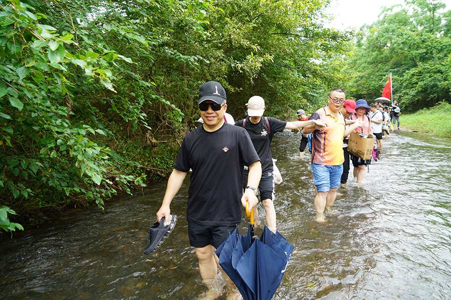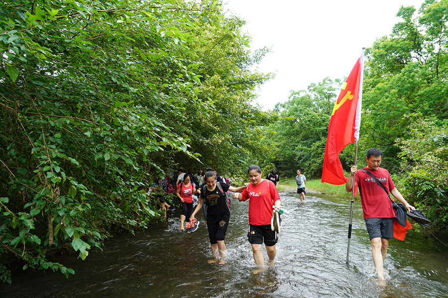 大雨過后,烈日當空,地表溫度迅速上升,空氣中的水蒸氣增多,汗液難于蒸發(fā),面對濕熱天氣,大家義無反顧的前進,衣服濕了又干,干了又濕。中午14點,隊伍進入一片樹林,起初地勢較為平坦、道路開闊……漸漸地,地面開始凹凸不平,有了越來越多的水坑,道路開始變窄,一條小溪攔住了隊伍。大家紛紛脫鞋下水,手拉著手、攙扶著后面的同志在溪水中行進,本著不能讓任何一個同志掉隊的信念,整個團隊相互鼓勁、相互扶持,克服困難,攜手踏過這段溪流。