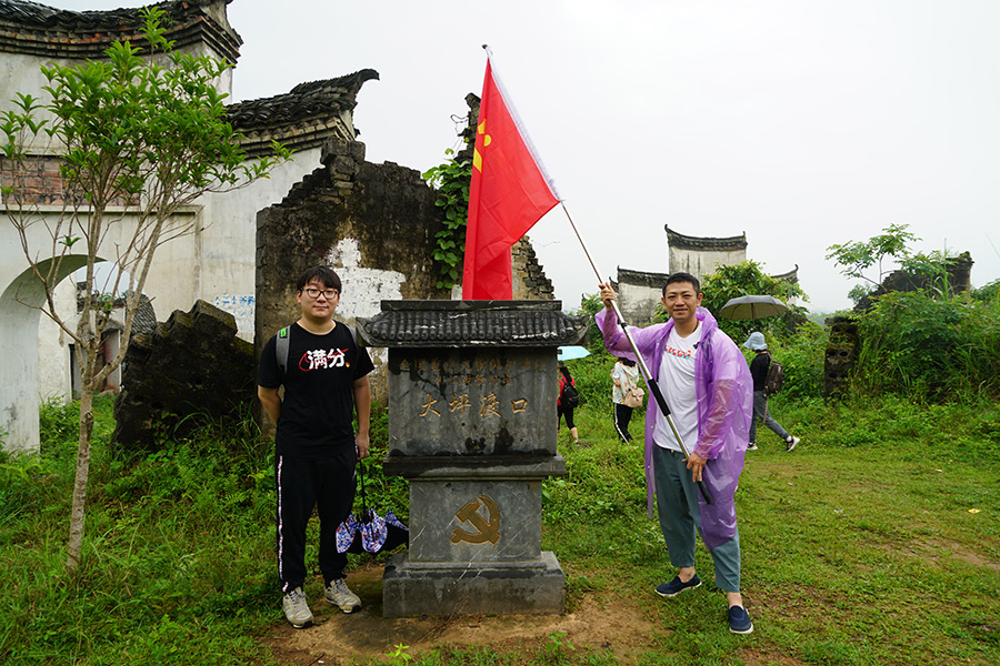 上午11點,同志們乘車到達全州縣紹水鎮(zhèn)下宅村,整裝齊隊,高舉黨旗,踏上了尋訪當年紅軍長征足跡,緬懷革命先烈的紅色之旅。行進中,天空下著瓢潑大雨,同志們一邊行軍,一邊唱紅歌,一邊品讀著紅軍長征的艱辛。