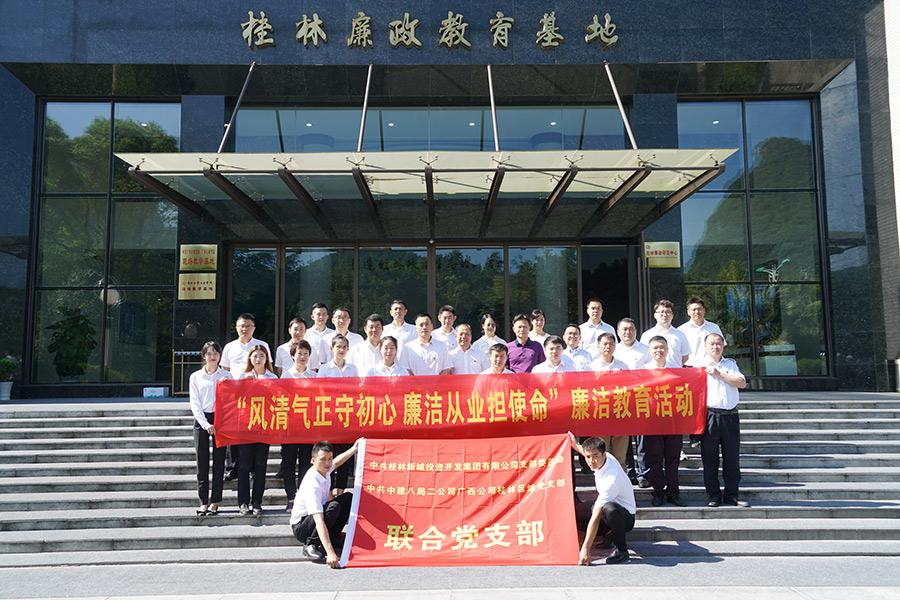 為進(jìn)一步增強(qiáng)桂林市紀(jì)檢監(jiān)察綜合業(yè)務(wù)基地建設(shè)工作的光榮感、使命感和成就感,7月31日上午,市紀(jì)委、市監(jiān)委特別安排基地主要參建單位中共桂林新城投資開發(fā)集團(tuán)有限公司支部委員會(huì)、中共中建八局二公司廣西公司桂林區(qū)域支部委員會(huì)聯(lián)合黨支部參觀了桂林廉政教育基地,開展了一項(xiàng)“風(fēng)清氣正守初心 廉潔從業(yè)擔(dān)使命”廉潔教育活動(dòng)。