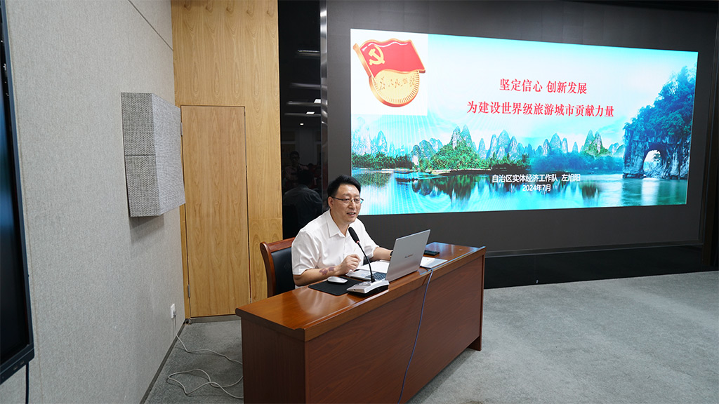 在活動(dòng)中,左旭陽還給大家上了一堂有思想、有深度、有意義的黨課。黨課以《堅(jiān)定信心 創(chuàng)新發(fā)展 為建設(shè)世界級旅游城市貢獻(xiàn)力量》為題,從多個(gè)方面進(jìn)行了深入的講解和闡述。他重點(diǎn)解讀了《中國共產(chǎn)黨紀(jì)律處分條例》,強(qiáng)調(diào)了黨風(fēng)黨紀(jì)建設(shè)的重要性和必要性;講解了《關(guān)于支持廣西加快打造國內(nèi)國際雙循環(huán)市場經(jīng)營便利地的若干措施》,探尋了發(fā)展的契機(jī);分享了工作中的創(chuàng)新及成果感悟,提升了黨員干部干事創(chuàng)業(yè)的“精氣神”;把脈新城投集團(tuán)的發(fā)展方向,增強(qiáng)了大家大有可為、時(shí)不我待的信心。