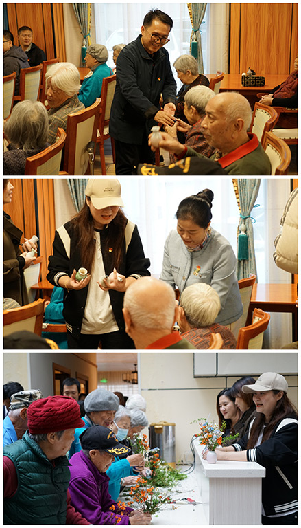 黨課結(jié)束后,老人們?cè)邳h員志愿者的陪伴下開展插花活動(dòng)。志愿者們將一個(gè)個(gè)小巧精致的花瓶親手送到每一位老人的手中。在一片歡聲笑語(yǔ)中,大家一邊享受插花樂趣,一邊分享彼此心得體會(huì),攜手創(chuàng)作出一件件精美的插花作品??粗约河H手制作的作品,老人們臉上流露出深深的成就感和自豪感。
