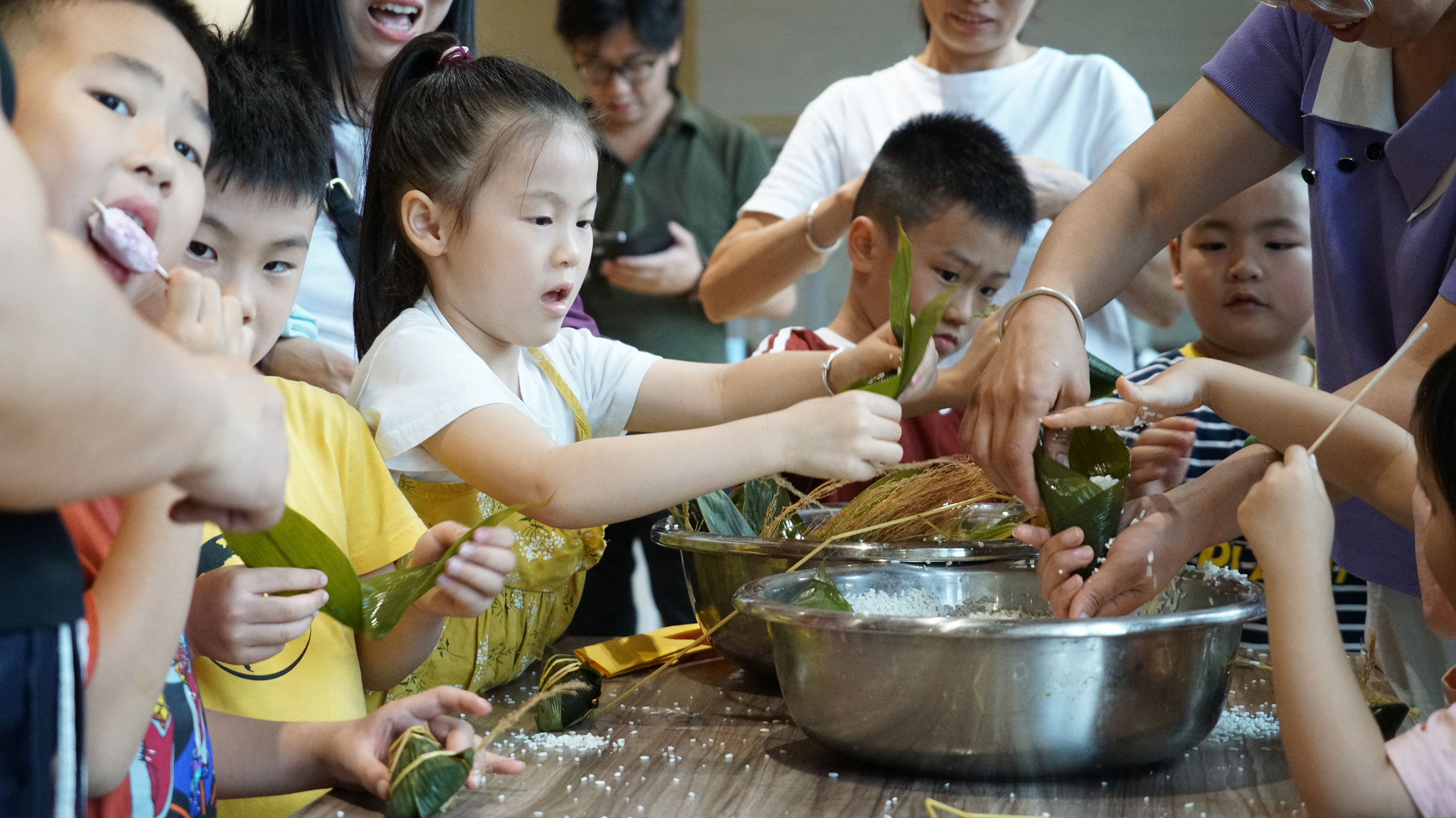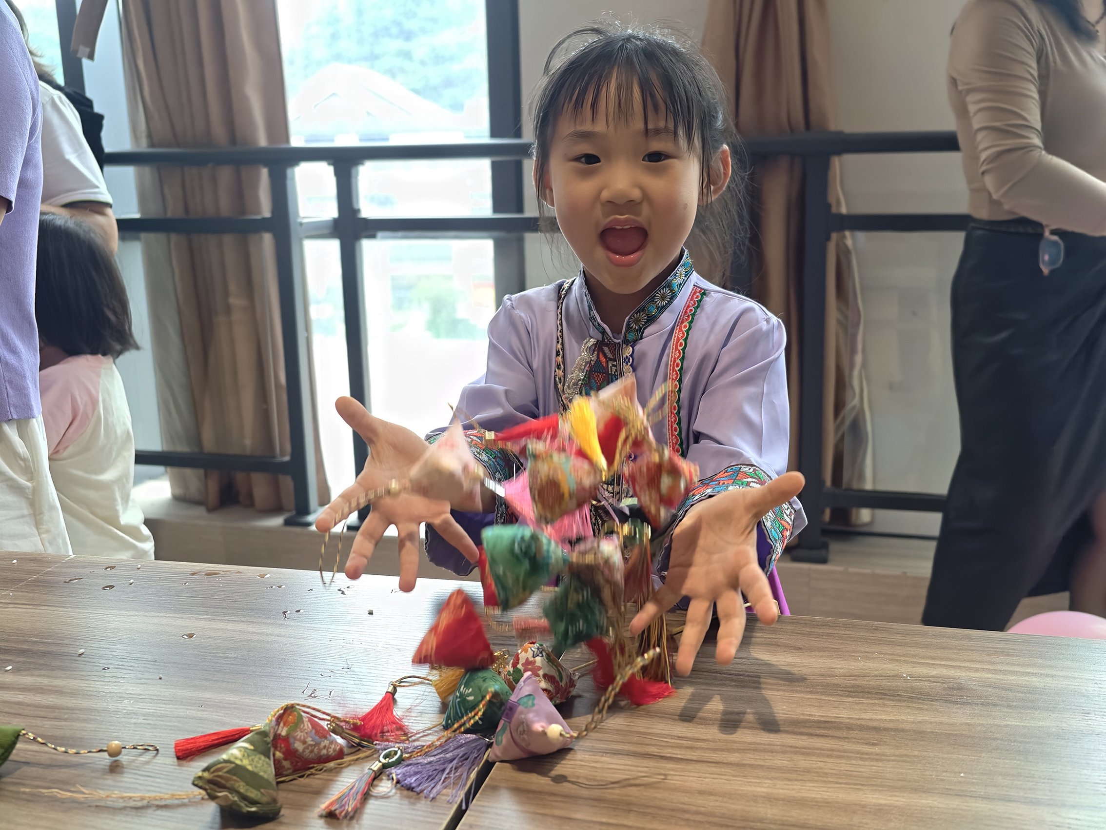 游戲環(huán)節(jié)結(jié)束后,大家開始包粽子、做香囊,孩子們圍著長桌,小手笨拙又興奮地學(xué)著大人的模樣包粽子、做香囊,翠綠寬大的粽葉在他們手中顯得有些調(diào)皮,不是卷不成錐形,就是裹不緊邊角。另一邊的角落,則是五彩斑斕的香囊世界,孩子們圍坐在一起,桌上鋪滿了色彩鮮艷的綢布、五彩絲線、亮晶晶的小珠子,還有散發(fā)著濃郁草藥香氣的艾草和菖蒲碎。他們用小手仔細(xì)地挑選著心儀的布料,小心翼翼地裁剪成小小的口袋形狀。穿針引線對他們來說是個(gè)不小的挑戰(zhàn),小眉頭微微蹙起,線頭有時(shí)會(huì)調(diào)皮地打結(jié),但他們依然樂此不疲。通過包粽子、做香囊使孩子們深入了解中國各民族在端午節(jié)的悠久歷史和豐富的非遺傳承文化,感受到傳統(tǒng)文化的獨(dú)特魅力。