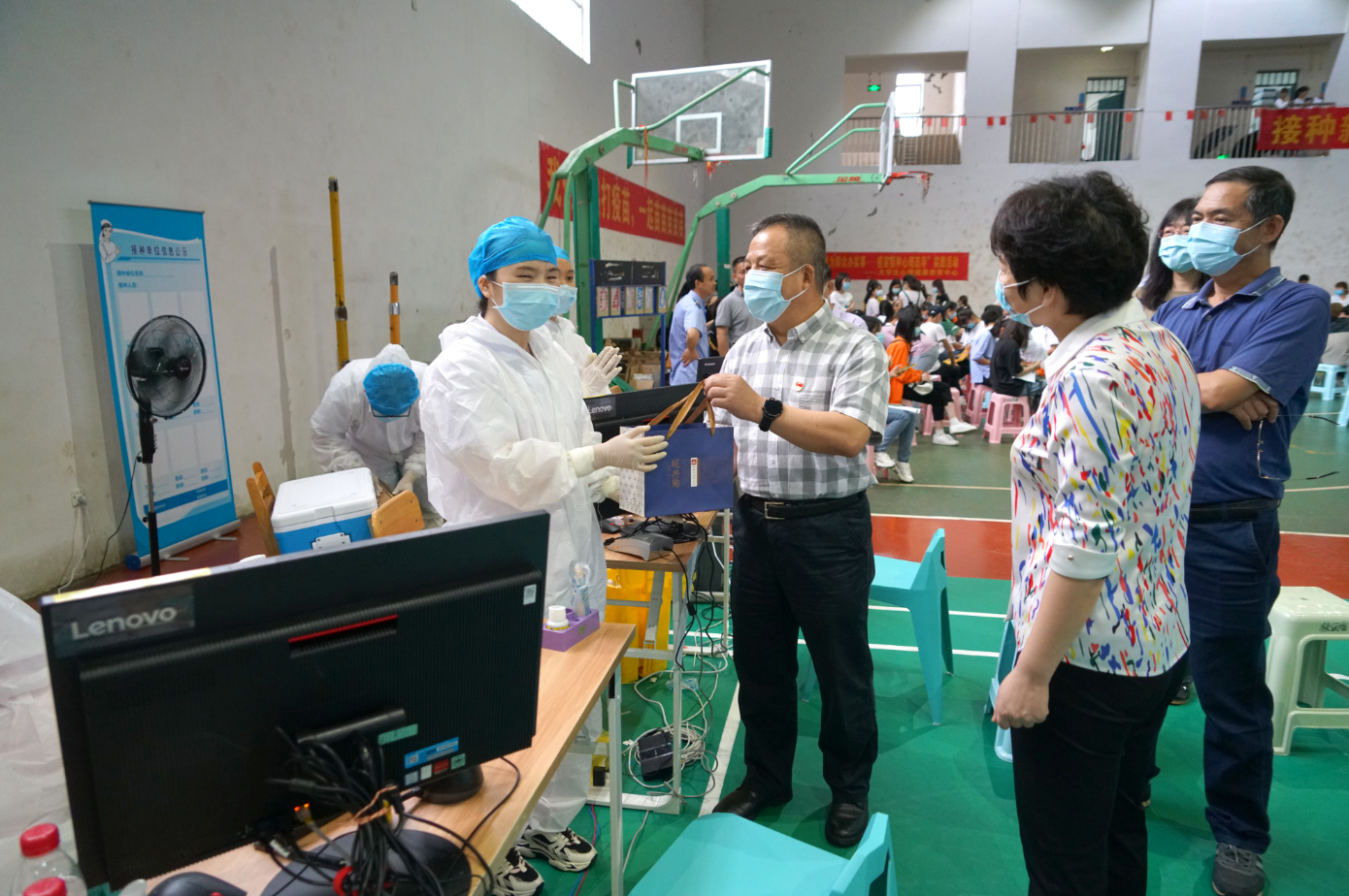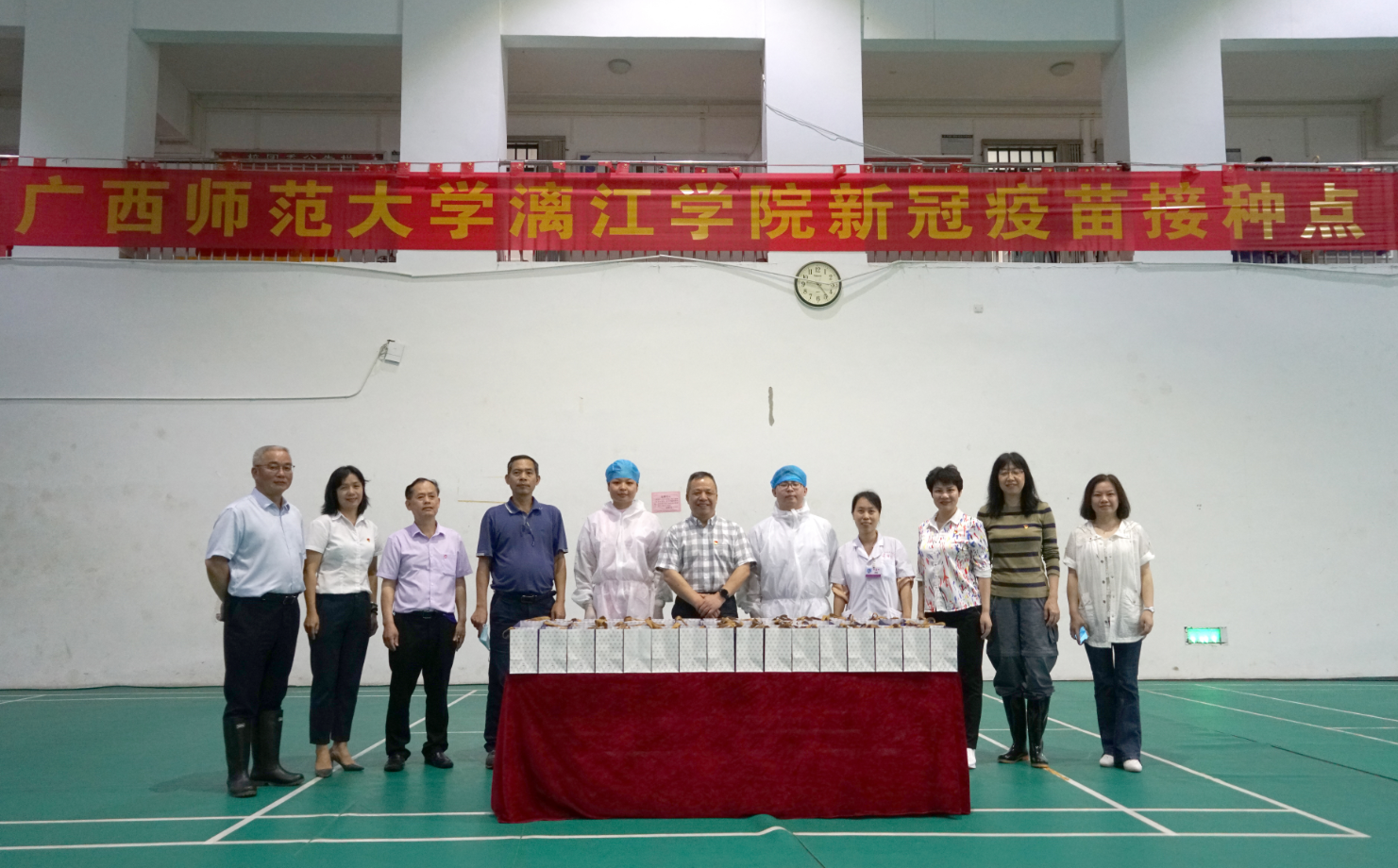 周道林一行在疫苗接種點查看接種情況、在留觀區(qū)詢問完成接種師生的觀察情況,并慰問了各服務(wù)點的醫(yī)護(hù)人員,代表新城投資集團(tuán)和漓江學(xué)院送上護(hù)士節(jié)的慰問品和祝福。