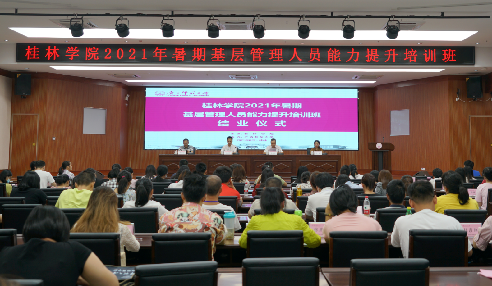 8月2日下午,桂林學院基層管理人員能力提升培訓班結業(yè)儀式在廣西師范大學育才校區(qū)國際教育交流中心報告廳舉行,共有來自桂林學院的98名基層管理人員參加了這次為期三天的培訓。廣西師范大學黨委常委、組織部部長林國慶,桂林新城投資集團黨總支書記、董事長、總經(jīng)理、桂林學院董事長周道林,桂林學院校長楊樹喆等出席結業(yè)儀式。廣西師范大學干部教育培訓學院辦公室主任許鋼主持結業(yè)儀式。