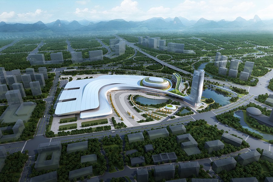 目前正在建設(shè)的桂林國(guó)際會(huì)展中心項(xiàng)目總投資額676016.31萬(wàn)元。新會(huì)展中心以“江作青羅帶”的漓江為藍(lán)本,設(shè)計(jì)為流水彎彎的“漓江彩帶”形象;會(huì)議中心以“漓江石”為模板設(shè)計(jì),寓意“石”來(lái)運(yùn)轉(zhuǎn);四星級(jí)酒店則吸收桂林城徽象鼻山的意象進(jìn)行設(shè)計(jì);設(shè)計(jì)了以龍脊梯田為意象的商業(yè)區(qū),以商業(yè)進(jìn)一步集聚和帶旺新區(qū)人氣等等,從規(guī)劃、選址、設(shè)計(jì)上無(wú)一不體現(xiàn)出對(duì)新會(huì)展中心精雕細(xì)琢、精益求精的設(shè)計(jì)理念和精神理念。