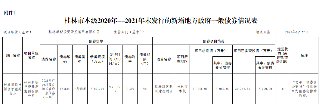 桂林新城投資開(kāi)發(fā)集團(tuán)有限公司關(guān)于2020年-2021年發(fā)行的新增政府債券使用和管理情況(一般債券)