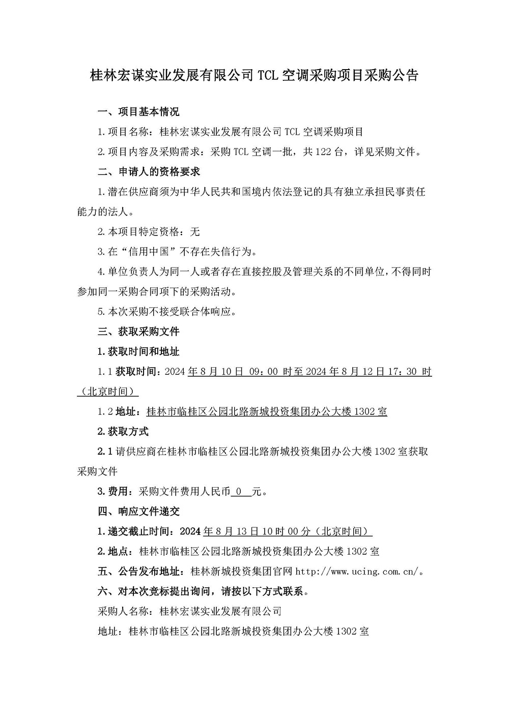 桂林宏謀實(shí)業(yè)發(fā)展有限公司TCL空調(diào)采購(gòu)項(xiàng)目采購(gòu)公告