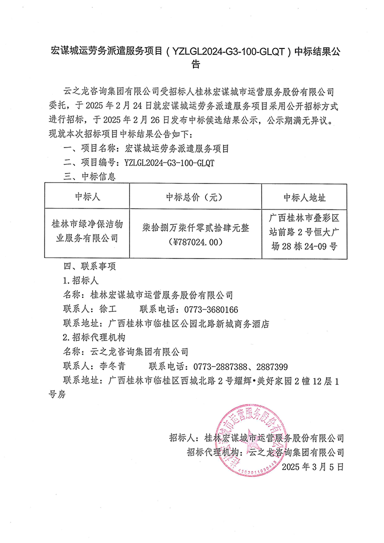宏謀城運勞務(wù)派遣服務(wù)項目(YZLGL2024-G3-100-GLQT)中標結(jié)果公告
