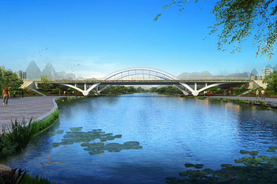 萬(wàn)平橋位于萬(wàn)平路與西城大道交叉口西側(cè),橫跨中心環(huán)形河水域,是目前臨桂新區(qū)所有橋梁當(dāng)中,投資最大、結(jié)構(gòu)最復(fù)雜、施工難度最大的一座橋梁。橋梁設(shè)計(jì)為中承式飛燕拱橋,采用Y構(gòu)鋼管混凝土拱橋組合體系,外觀新穎獨(dú)特,顏色鮮明亮麗,橋長(zhǎng)123m,橋面寬度60m,全橋分左右兩幅,每幅橋在人行道及中央分隔帶處各設(shè)置拱肋,共設(shè)4道拱肋、28根吊桿。